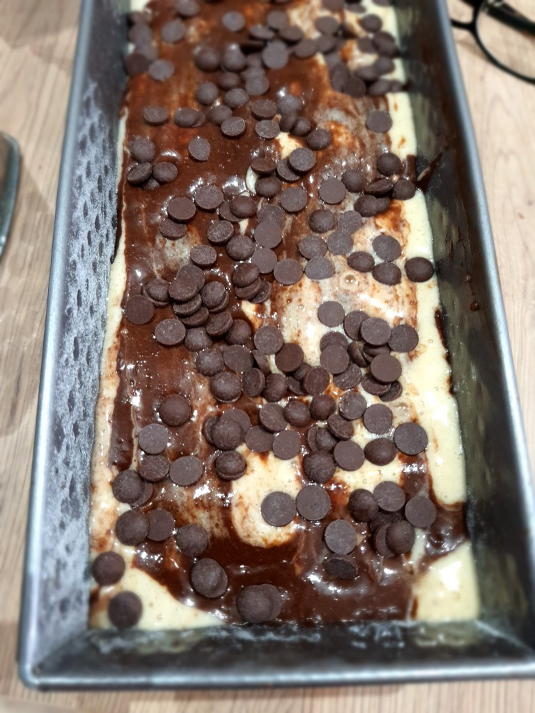Fondere a bagnomaria il cioccolato con il burro e nel frattempo montare bene le uova insieme allo zucchero. Unire al composto la farina, il lievito e la farina di mandorle, poi amalgamare bene il tutto. Separare l’impasto in due recipiente, ad uno aggiungere le gocce di cioccolato ed all’altro il cacao ed il burro fuso insieme al cioccolato. Ora imburrare uno stampo da plumcake e versare alternando le creme fino a terminarle. Cospargere di gocce la superficie e cuocere in forno a 160° per 50 minuti.