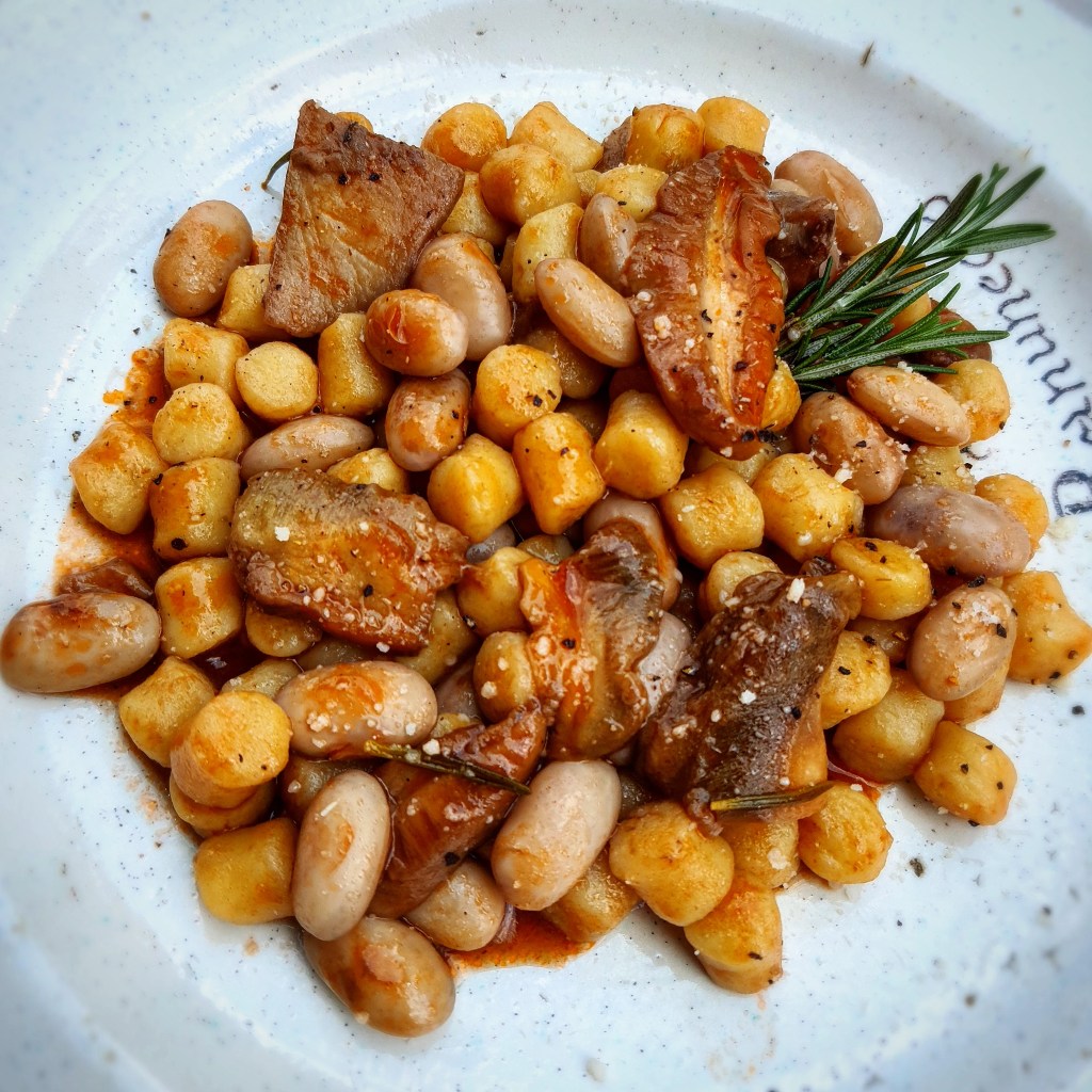 In un’altra padella, versare un altro filo di olio, mettere la cipolla tagliata sottile e lasciarla dorare. Aggiungere successivamente i fagioli lessati, il rosmarino, il concentrato e mezzo bicchiere di acqua